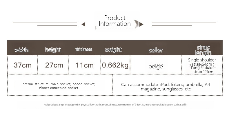 | Internal structure | zipper concealed bag, phone bag |