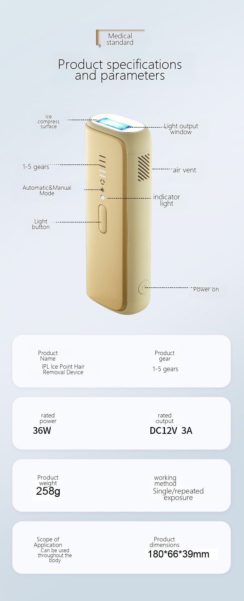 | Hair removal device wavelength | 530-1200nm |